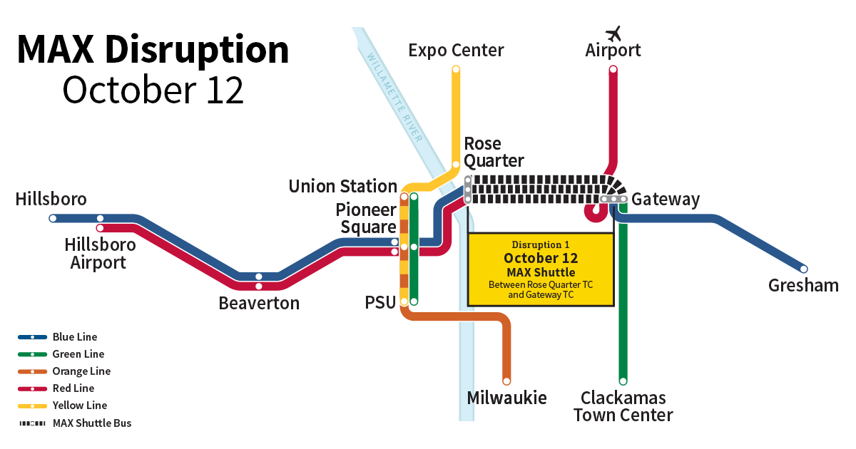 10 月 12 日星期日:MAX 蓝线、绿线和红线将中断。摆渡车将在Rose Quarter Transit Center 和Gateway/NE 99th Ave Transit Center 之间为 "站 "提供服务。