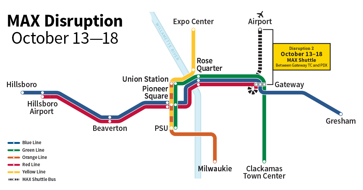 10 月 13 日(星期一)至 10 月 18 日(星期六):MAX红线服务将在 Gateway 和Portland International Airport